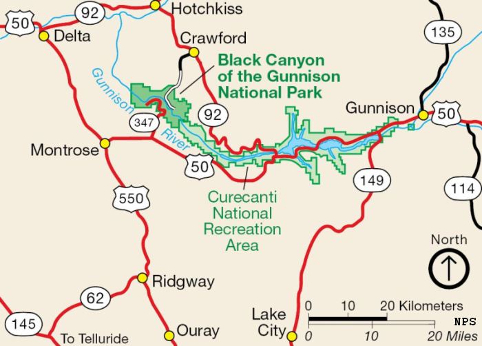 Area Road Map locates the Black Canyon of the Gunnison National Park, and Curecanti National Recreation Area in the canyon south of the park, along US50 between Delta and Gunnison, and CO92 along the north rim of the canyon south of the park between Crawford and Gunnison.
