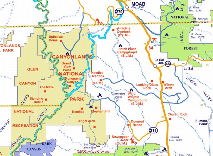 Maps includes a map of Canyonlands, and maps of each of the districts, some include the GCNRA, Overlooks roads includes U211 into Needles.