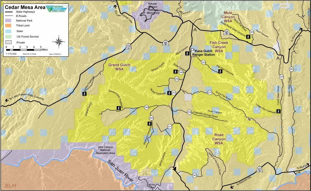 Cedar Mesa Map shows roads, canyons, and ruin sites inside the Cedar Mesa plateau. It may be difficult to read on low resolution monitors.