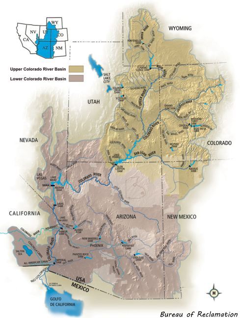 Basin drainage has a map of the drainage of the Colorado River Basin, with maps of the drainage basins of the three largest tributaries of the Colorado: Green River, San Juan River, and Gila River. Basin graphic is a graphical view of the Colorado River Basin.