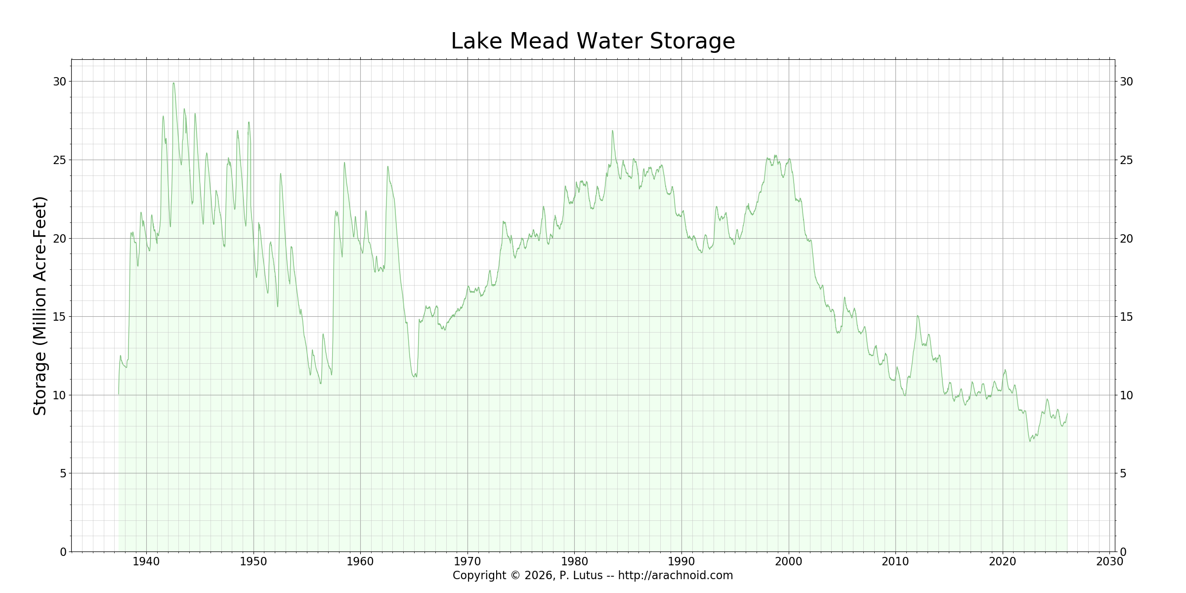 This 27-year mega-drought (as of 2026) is the worst drought in 1,200 years [NPR News]. The Ancestral Puebloans left the four corners area around 1,200 years ago, presumably because of a 50-year drought [Edwin Barnhart, PhD, Maya Exploration Center]. The loss of water in Lake Powell and Lake Mead is significant, a combined loss of 13.73 trillion gallons. The declining elevations have been threatening to close the hydroelectric plants that supply electricity to millions of homes in the southwest, although, for the moment, that threat has lessened. These graphs show the declination of the contents of the lakes/reservoirs: Lake Powell - Lake Mead. These reservoirs, the two largest in the US, collect winter snowmelt in the spring to prevent flooding and to store water for summer useage.