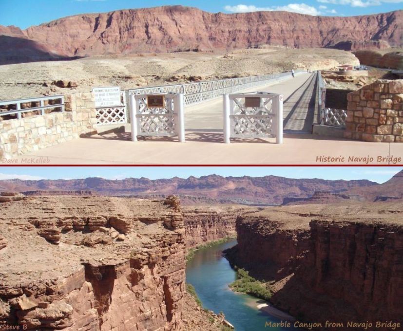 Conventions - highlight, infoBoxes, and underline: Move the mouse over highlighted text to open an information box with more information, a definition, an explanation, or to display a photo. Underlined text opens a new window. Underlined highlighted text opens an information box with an option to open a new window for more information or to display a photo. (Select the highlights/underlines above as examples.) When an information box cannot be aesthetically located near its highlight, it will appear on top of the page title or in the upper-left corner of the page. The historic Navajo Bridge is now a pedestrian walkway with a spectacular view of the Colorado 467' below in Marble Canyon - click to view its photo