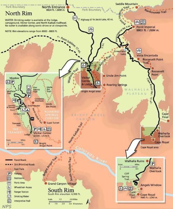 Corridor Trails is a map of the three corridor trails, North Rim Map show the North Rim Village and the corridor trails, Arizona National Scenic Trail Map is a graphic of that trail, and Wide Area Map is a map of Grand Canyon with the surrounding highways.