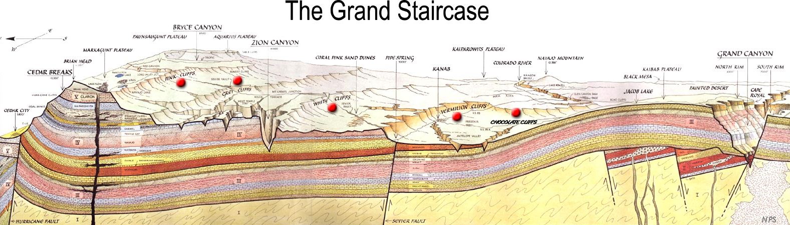 Note: This article is about the huge geologic formation known as the Grand Staircase (graphic above); the Grand Staircase-Escalante National Monument in Utah is a different topic (it is on the National Parks menu). It seems to me that no one is interested in the Grand Staircase anymore, just in the National Monument, but we found sufficient material to put this article together.