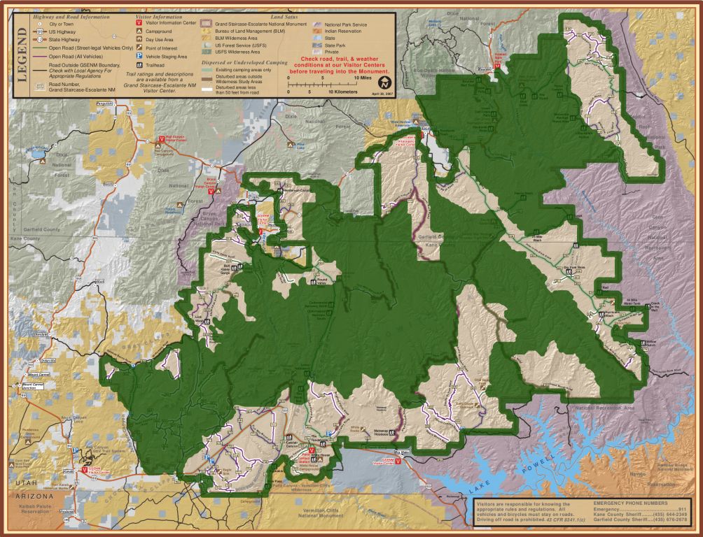 The Bureau of Land Management (BLM) is the federal agency that manages America's public landsThe Grand Staircase-Escalante National Monument is huge - 1,880,461 acres (7,610 sq km), larger than the state of Delaware. It was created amid controversy (more about that later) by President Bill Clinton in 1966 using the Antiquities Act. The Monument includes part of the Grand Staircase, the Kaiparowits Plateau, and part of the Canyons of the Escalante, all in southern-central Utah. The Monument extends from the towns of Big Water, Glendale, and Kanab in the south and southwest, to the towns of Escalante and Boulder on the northwest, to Canyonlands Nat'l Park on the northeast, and Glen Canyon NRA on the east and south. The Monument encompasses private and state land and state parks, and county, state, and federal highways. Much of it is wild backcountry with geologic wonders seen only by backcountry hikers. The Monument is so large that it requires four visitors centers: in Connonville, Big Water, Escalante, and Kanab. The Monument is managed by the BLM.