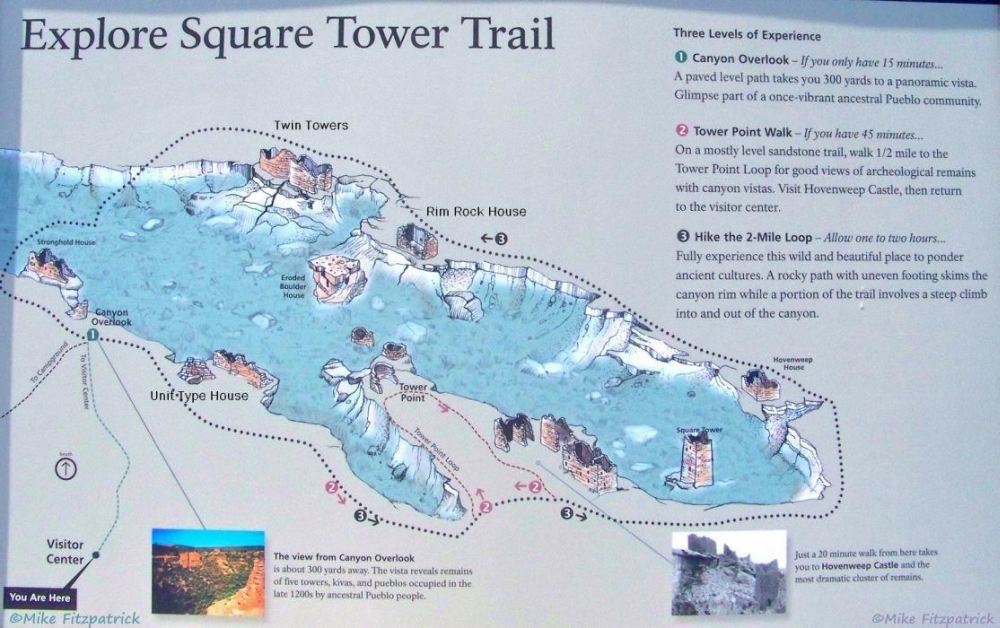 Explore Sq[uare] Tower Trail and Hovenweep Info[rmation] are graphics of Square Tower Trail around Little Ruins Canyon and the Square Towers Unit.