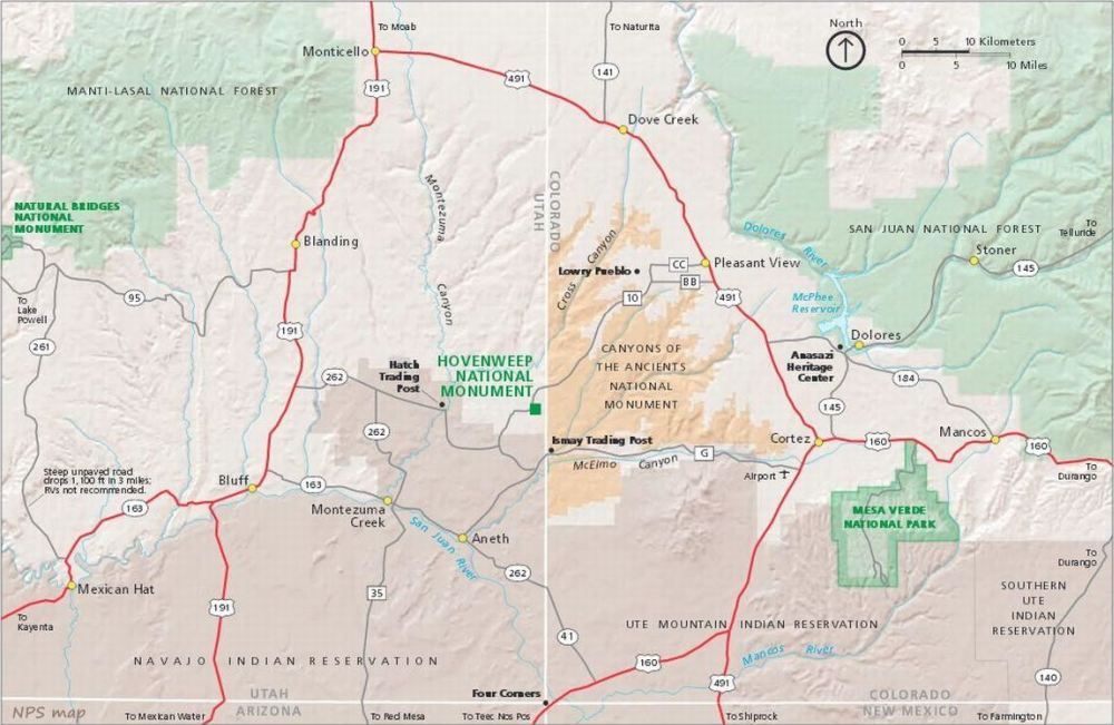 The Visitor Center is at Little Ruins Canyon, which contains the Square Tower Unit, the most visited site in Hovenweep. The other ruins are more difficult to reach. Cajon is nine miles southwest of the visitors center on county road 413 and Navajo spur 405 at the head of Allen Canyon. Northeast on county road 212 in Utah into Canyons of the Ancients National Monument on country road 10 in Colorado is Holly at the head of Keeley Canyon, Horseshoe in Horseshoe Canyon and Hackberry in Hackberry Canyon, and the trail to Cutthroat is 4.5 miles farther on county road 10. Goodman Point Pueblo, the largest unit, is distant to the east in Goodman Canyon inside Canyons of the Ancients National Monument, near Delores, Colorado. It is interesting how the NPS places part of Hovenweep inside another national monument managed by the BLM.