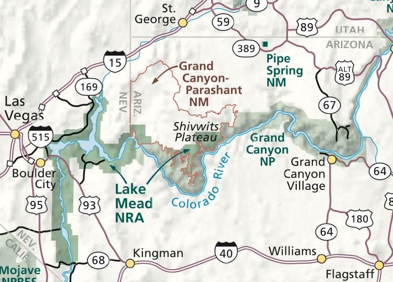 Area Road Map is a wide area highway map of roads surrounding Lake Mead NRA and the Grand Canyon.