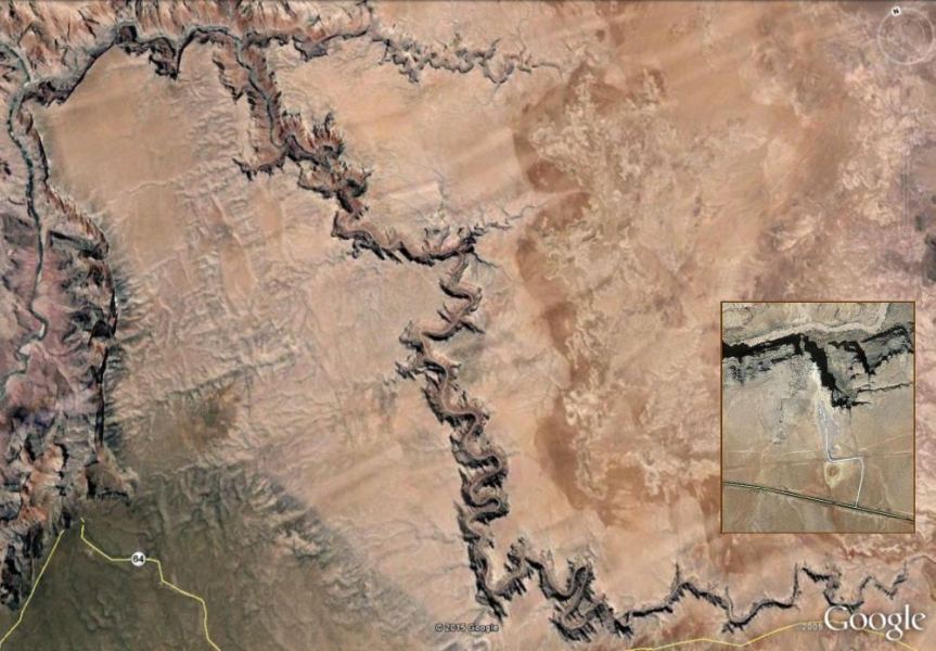 The Satellite image is a Google Earth satellite view of the Gorge from near Cameron to its confluence with Colorado River in the Grand Canyon, with an insert pointing to the Navajo Nation Park site - the first official viewpoint along AZ64.