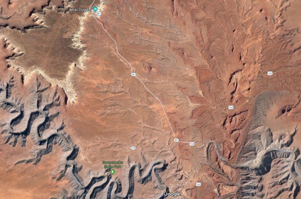 Outstanding scenic panoramic views are visible from Muley Point on the edge of the Cedar Mesa escarpment, at/near the point visible in the background, reached by a dirt road off U261 just north of Moki Dugway. This back road to Mulely Point is faintly visible above the top of Moki Dugway on the U261/US163 map. Many people stop at the first overlook on the edge of the escarpment, which many call Muley Point, the road west to Muley Point, which is on the edge of the point, is significantly smaller and rougher. From either point, Monumnent Valley is on the horizon behind Raplee Ridge, Goosenecks State Park is not far away, and the goosenecks of the San Juan River west of the park are immediately below the point.