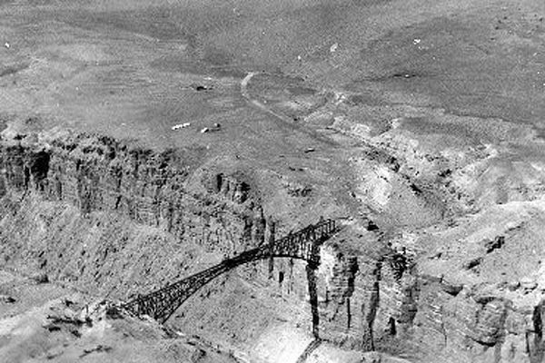 Construction of the US89 Grand Canyon Bridge over Grand (Colorado) River in Marble Canyon began in 1927, a short distance downstream from Lee's Ferry. In 1928 the ferry capsized, drowning three men and dumping a Model T into the river. With the bridge nearing completeion, the ferry did not reopen. The Grand Canyon Bridge opened for traffic in 1929, was renamed Navajo Bridge in 1934. By 1934, US89 was a 1,685-mile border-to-border highway from Mexico to Canada.
