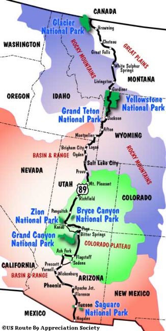 With I-19 covering the exact route, US89 between Nogalis and Flagstaff was decommissioned as a federal highway in 1992, becoming part of the Arizona state highway system. Scenic Arizona highway AZ89 through Prescott and highway AZ89A from Prescott through Sedona, is historic US89, rejoining US89 in Flagstaff, where it resumes its route to Canada (although it is not signed as US89 inside Yellowstone National Park).