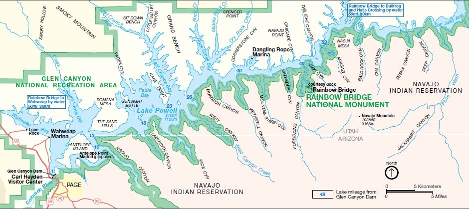 The Map from NPS locates Rainbow Bridge inside GCNRA, Road map covers a wide area around Rainbow Bridge in Utah and Arizona.