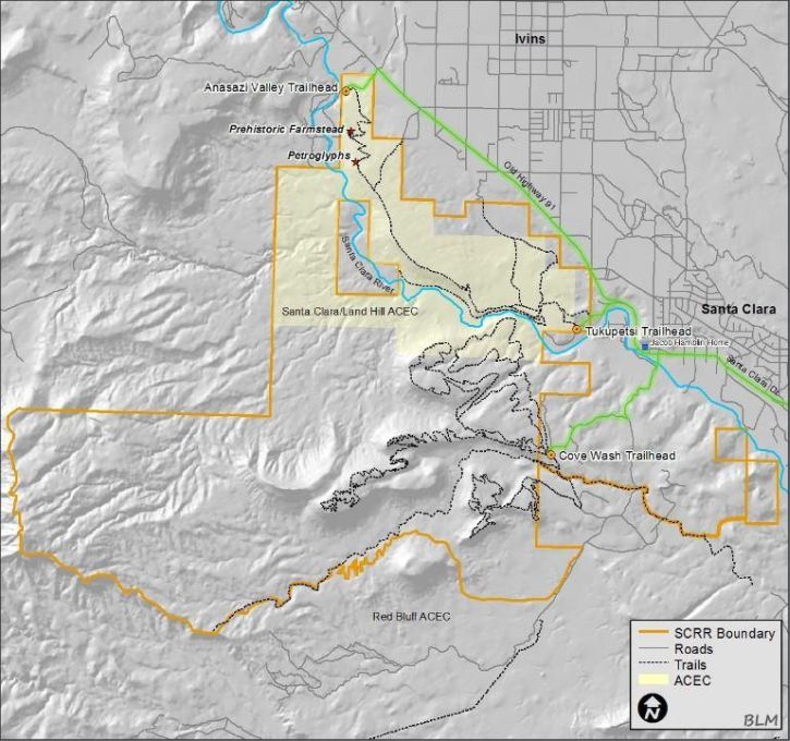 From the BLM: “The SCRR [Santa Clara River Reserve] encompasses the entire 1,645 acre Santa Clara/Land Hill Area of Critical Environmental Concern (ACEC) which contains numerous prehistoric sites and essential riparian habitat. Critical habitat for Threatened and Endangered plant species including the Dwarf Bearclaw Poppy (Arctomecon humilis) and the Holmgren Milkvetch (Astragalus homgreniorum) is also incorporated into the SCRR. [The Red Bluff ACEC borders the Land Hill ACEC on the south, the Shivwits Reservation borders it on the west.]