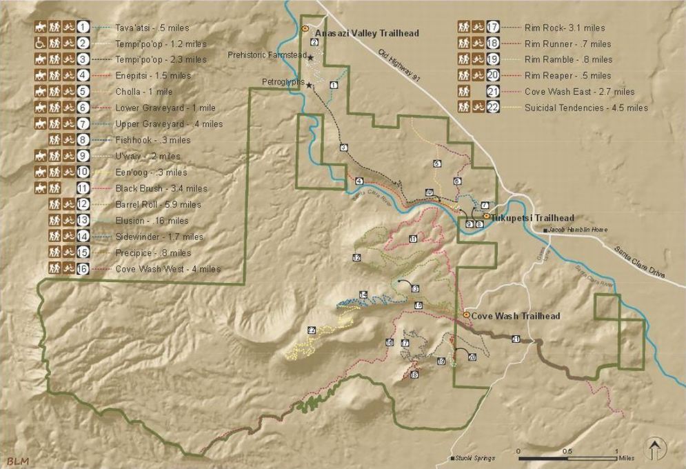 There are 22 trails in the SCRR, some of which have interesting names like Rim Reaper, Precipice, and Suicidal Tendencies; all trails are non-motorized - the trails map has keys/icons for permissible access on each trail.