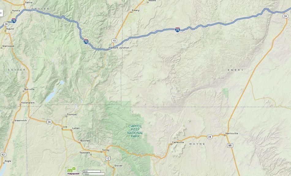 The 152 miles between Scenic Byway 24's east and west junctions with I-70 is significantly longer than the equally scenic 99 miles as I-70 climbs Salina Canyon to the highest freeway elevation in Utah (7,980' at Emigrant Pass on the Wasatch Plateau). I-70 climbs onto and crosses San Rafael Swell, dropping down 8-mile hill across San Rafael Reef to once again meet Scenic Byway 24 at mile marker 147. If I counted correctly, there are seven pullovers/viewpoints with some awesome scenic vistas on I-70 as it crosses the Swell.