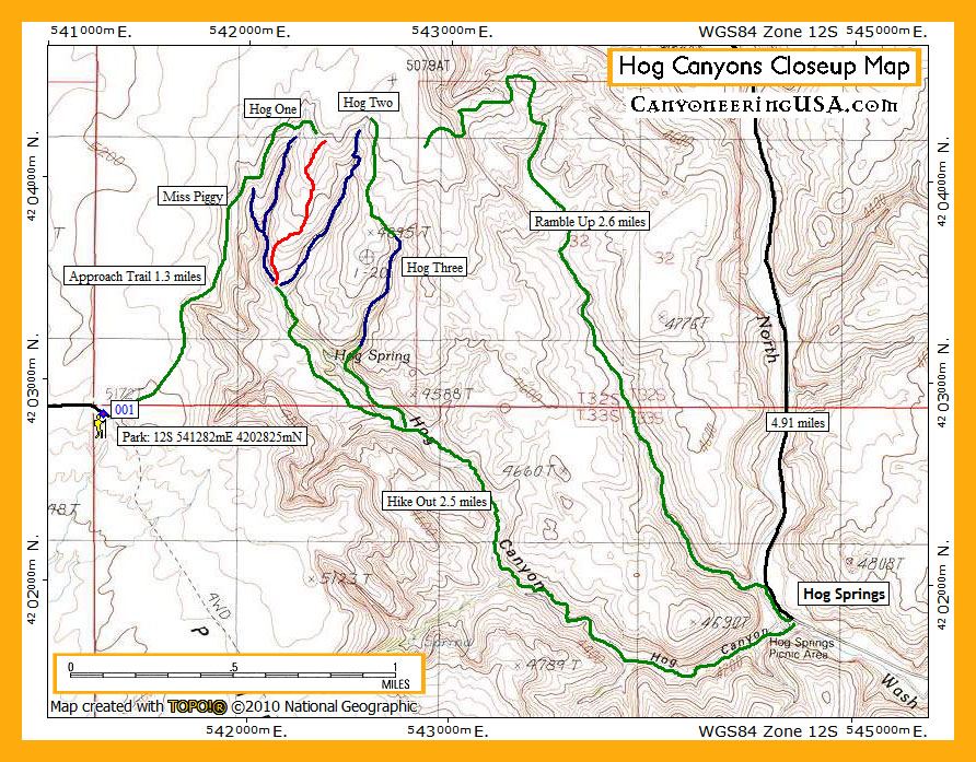 Hog Springs Rest Area/Trailhead/Canyon. A year-around stream in the desert? That's Hog Creek! Hog Springs Rest Area is the trailhead for an easy 1-mile hike up Hog Canyon between 800' walls of layered Wingate and Kayenta sandstone to the first waterfall and pool. It gets seriously tougher the next mile to Hog Spring with more pools and waterfalls, and yet more difficult beyond that as the canyon splits into multiple forks with narrow slot canyons, two of which appear after the next photo. Select Map of Hog Canyons, and more info for North Wash slot canyons information and a wild search and rescue story.