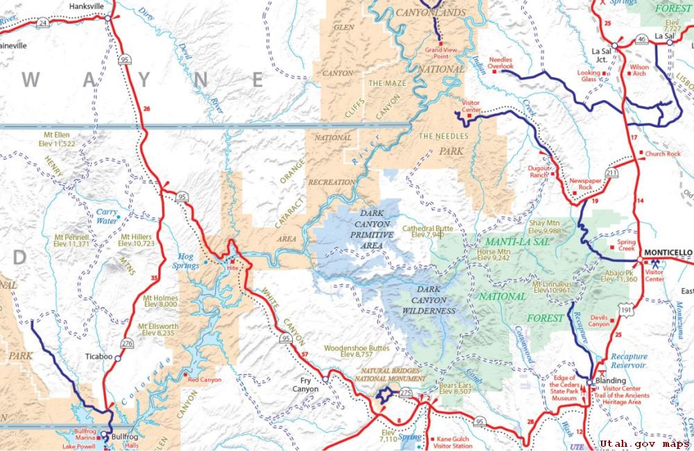 basin) in a dangerous, winding section of the highway, passes two North Butler Wash trailheads, cuts through the Comb Ridge monocline, passes the restored Mule Canyon ruin between milemarkers 102 and 101, meets U275 to Natural Bridges National Monument, meets U261 that crosses the center of Cedar Mesa and drops down dirt switchbacks into the Valley of the Gods, crosses Fry Canyon near Fry Canyon Lodge, runs inside White Canyon (with its infamous Black Hole) from Natural Bridges to Hite, crosses the Bridge at Hite Crossing over the Colorado and Lake Powell in massive Glen Canyon at its junction with Cataract Canyon, and turns northwest up North Wash to Hanksville, passsing Hog Springs Rest Area, Hog Canyon, and trailheads to several slot canyons.